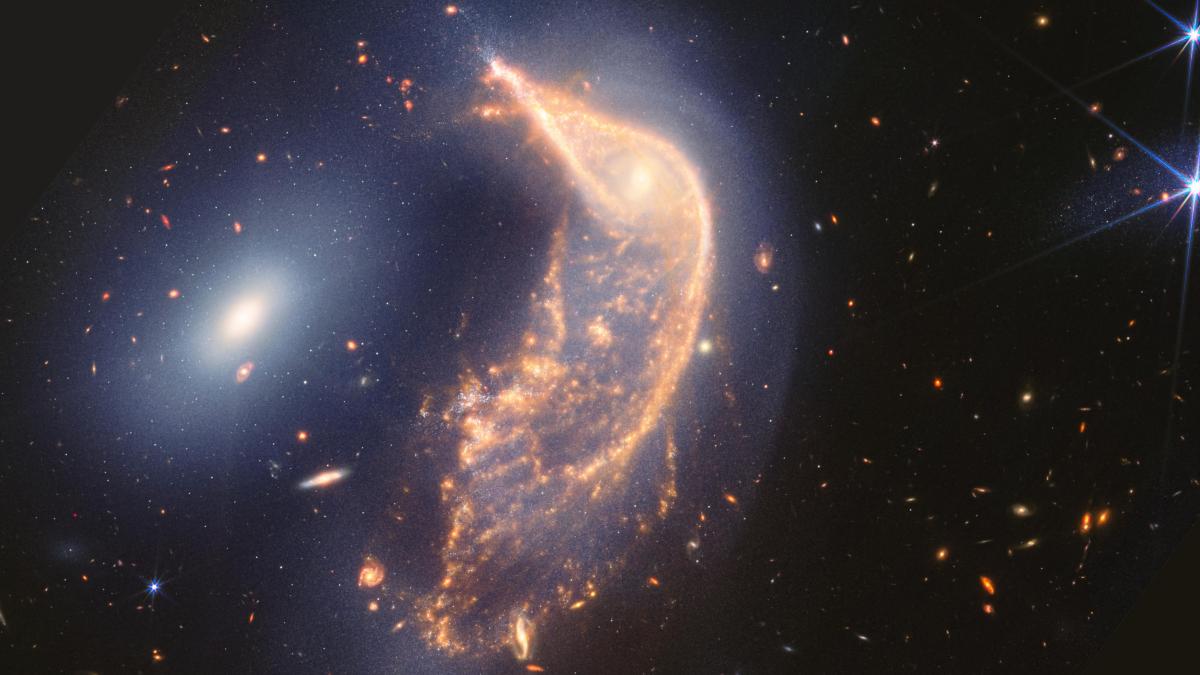 This NIRCam view of the Penguin and the Egg displays a smoke-like appearance, while the “eye” of the Penguin shines brilliantly: corresponding to the center of what was, up until perhaps 75 million years ago, just a normal-appearing spiral galaxy. The gravitational encounter with the “Egg” galaxy has distorted and distended the less massive spiral galaxy into the shape now seen here.