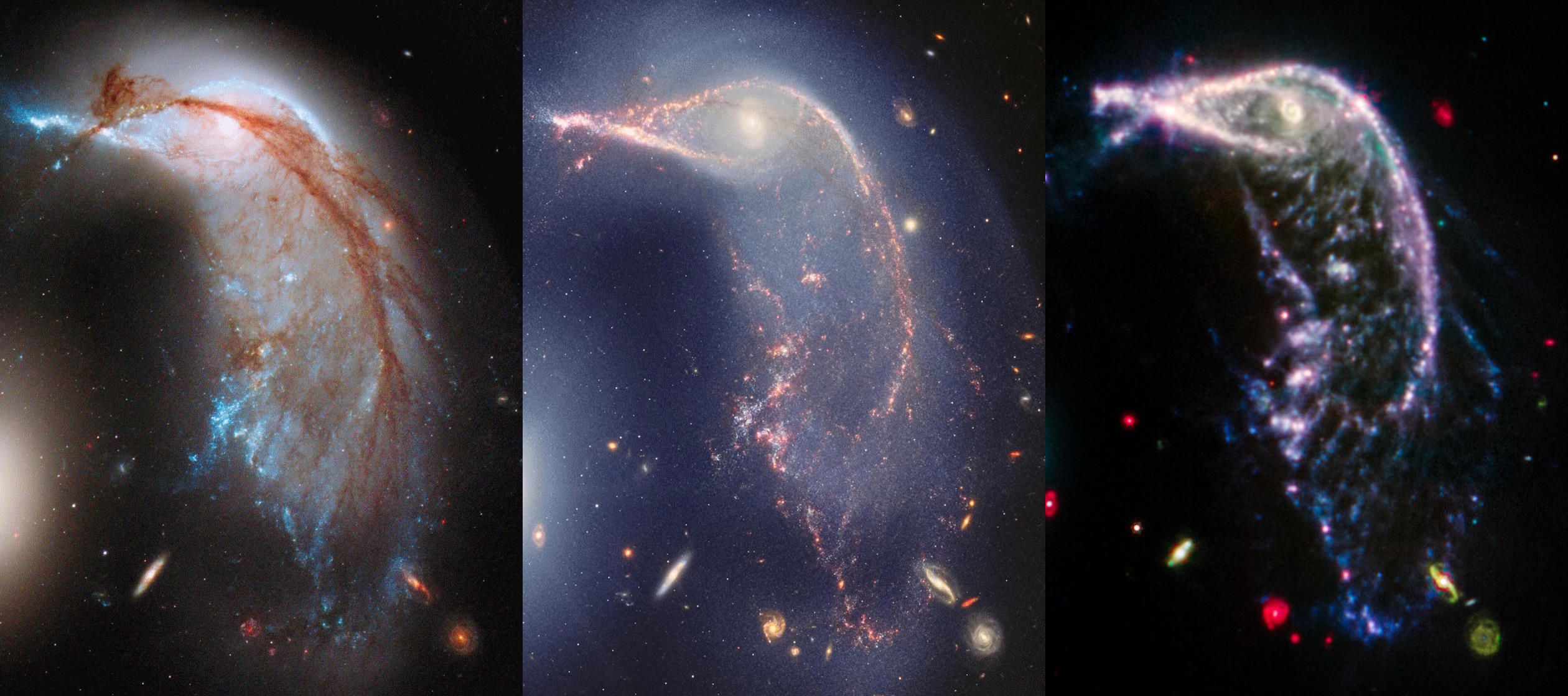 These three views show the visible light (left), near-infrared (middle), and mid-infrared (right) views of the Penguin galaxy that’s part of Arp 142. The galaxy takes on a seahorse-like appearance in mid-infrared light, as polycyclic aromatic hydrocarbons, old, cool stars, and cold dust are highlighted.