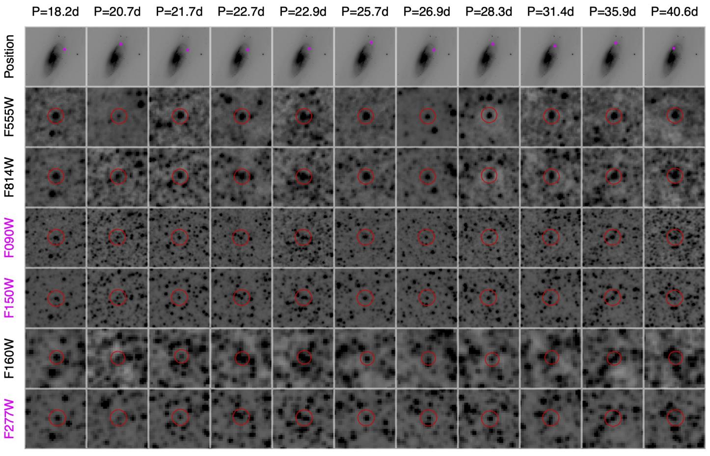 This image shows several Cepheid variable stars with different periods within nearby galaxy NGC 4258: an important galaxy for Cepheid and distance calibrations. The bottom 6 rows show the same stars as measured by both Hubble (grey labels) and JWST (purple labels) at various wavelengths. The superior resolution in JWST images reduces prior Hubble errors by significant, substantial amounts while validating and remaining consistent with prior results.