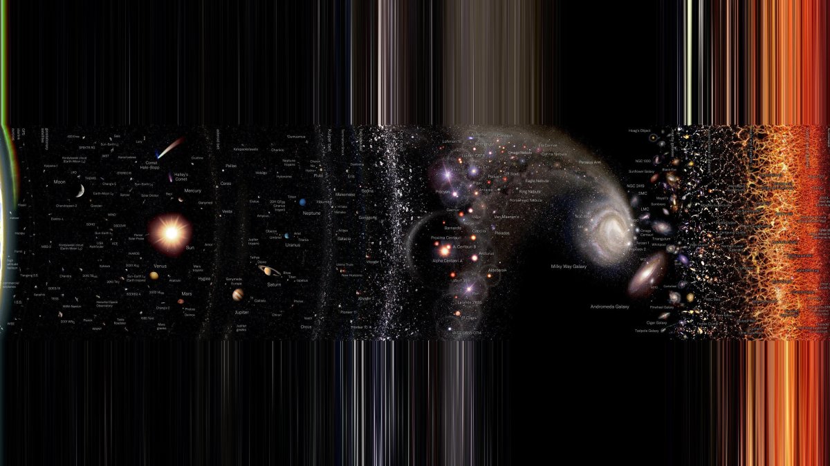 This vertically oriented logarithmic map of the Universe spans nearly 20 orders of magnitude, taking us from planet Earth to the edge of the visible Universe. Each large “mark” on the right side’s scale bar corresponds to an increase in distance scales by a factor of 10.