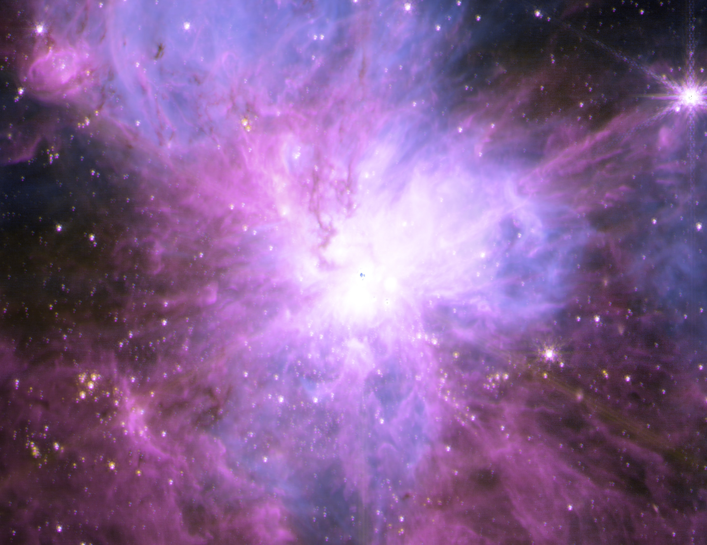 This composite image shows hard X-rays, soft X-rays, and ALMA (radio wave) data all together at the core of star-forming region N79. A single massive protostar, 500,000+ times the brightness and 60,000+ times the volume of our Sun, may be triggering the formation of 1000+ new stars/protostars.