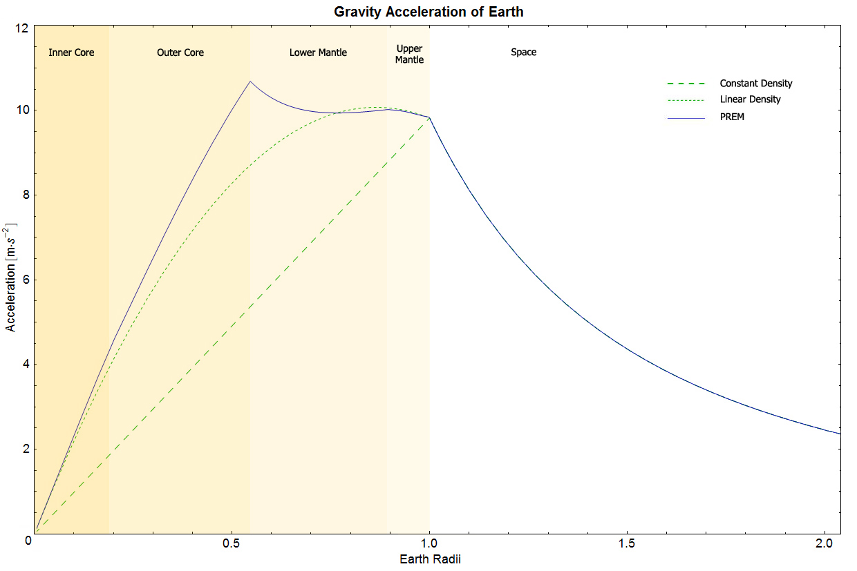 In other words, you, an object subjected to the gravitational force of a planet like the Earth, can only feel the gravitational effect of the portion of the Earth that lies interior to you, assuming that everything external to your position is spherically symmetric. In electromagnetism, this is a proven consequence of Gauss’s law; in gravitational physics, it was first proven by Newton for his law of universal gravitation, and was shown to be true even in the context of general relativity as a consequence of (the related) Birkhoff’s theorem. From a practical perspective, this means that once you start falling through the Earth, you experience smaller and smaller amounts of the total internal mass’s gravitational pull.