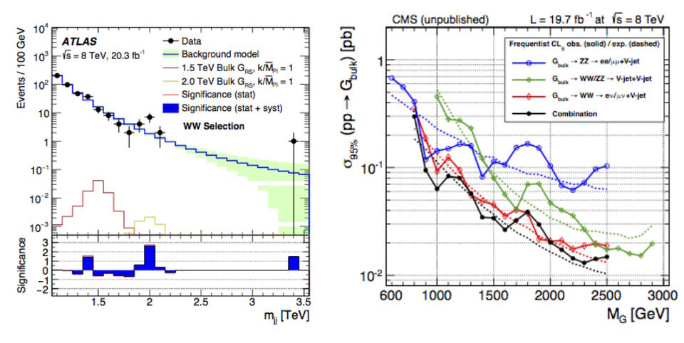 Two scientific graphs with data points and error bars compare events against energy levels (GeV), labeled ATLAS and CMS. The plots, which include fit models and confidence intervals (±1σ and ±2σ), reveal unexpected results in certain energy ranges.