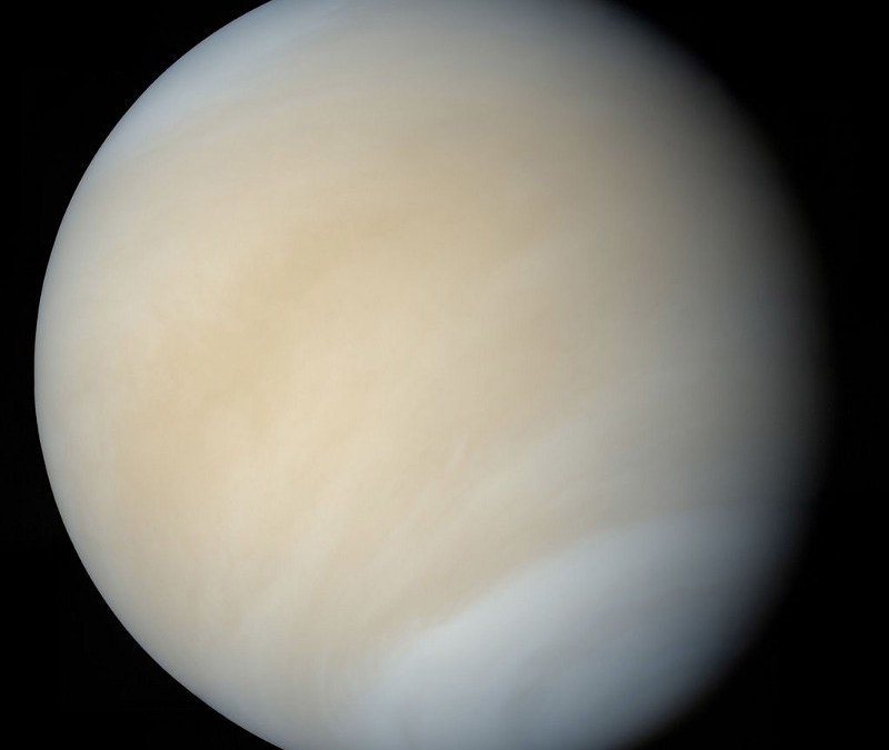 Ultraviolet image of Venus’ clouds as seen by the Pioneer Venus Orbiter. The dark regions are still not fully explained, and UV-absorbing microorganisms may yet play a role in Venus’s appearance. (NASA)