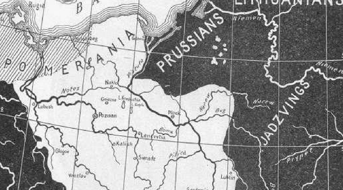 Poland at the time of the death of Boleslav the Wry-Mouthed 1138 : how could one resist a map with a title like that? Not that the map isn’t remarkable in its own right. The starkly contrasting colour scheme with sinuous black rivers slicing through Polish white and white streams dissecting the the encircling black lands, the mention of better- and lesser-known lands and tribes (the Kurons and the Jadzvings!) and the delicate amplification of the coastline, making waves deep into the Baltic Sea: it all lends an unreal air to the map.