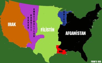 The three countries most affected by American foreign policy get a big slice of the US, Iraq occupying the West Coast, Afghanistan the eastern part up to the Mississippi, Palestine most of what’s in between. A purple sliver between Iraq and Palestine is reserved for something I can’t translate. Bizarrely, two UN institutions get Louisiana (WHO) and Wisconsin and some of Michigan (Unicef).