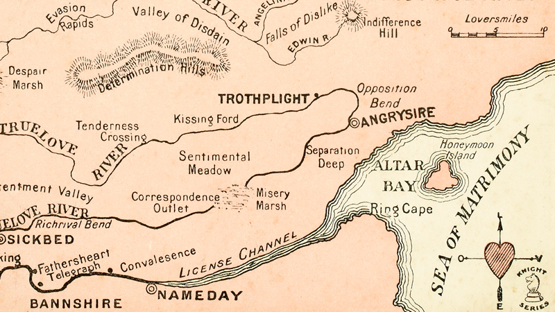After the Evasion Rapids, a river branch dead-ends at Despair Marsh, while its main flow turns sharply south at Pity Bend, then avoiding Friendship Corner to reach Tenderness Crossing, Kissing Ford and eventually Trothplight.
