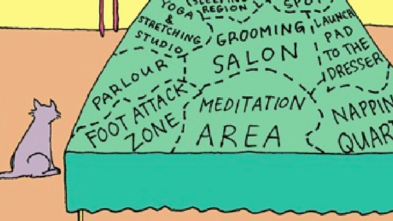 Anybody who’s ever had a cat can testify to the fact that cats, while at times very friendly, cuddly and agreeable to people, in essence are solitary animals with an agenda of their own. To some exasperated owners, returning home after a hard day’s work to find the cat still curled up in the same place as when they left for the office, the question may arise: who is who’s pet? That’s sort of the attitude expressed in this cartoon map, which shows what cats really make of the bed of their ‘owners’.