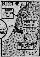 Already in 1937, there were proposals to partition the British mandate area of Palestine into a Jewish and an Arab state. The proposal, probably drawn up under the aegis of the League of Nations, doesn’t quite look like the first one of its successor organisation, the United Nations, 10 years later. The new Jewish state would occupy Galilee in the north, and a coastal strip divided by a separate area including Jerusalem and the coastal town of Jaffa. These would apparently both remain under British mandate, with the rest of the territory (Cis- and Transjordan) becoming a new Arab state.