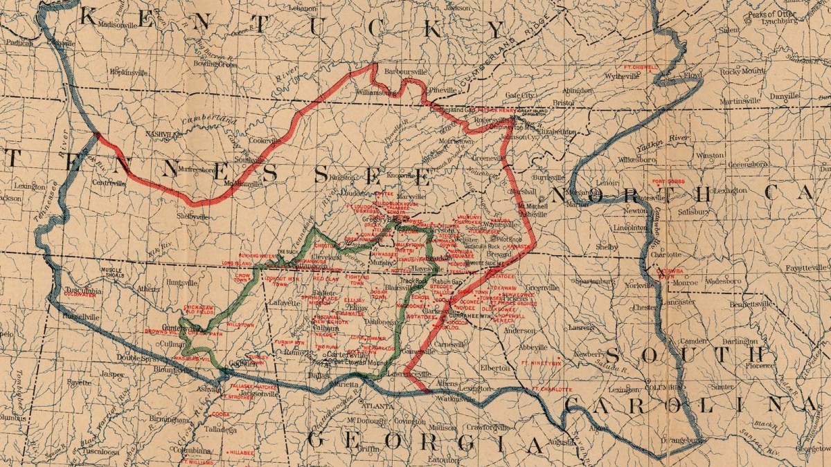 • Cherokee boundary at final cession (green line): the southern border remains the same, but in all other directions, the Cherokee Country has shrunk, now only occupying small parts of Alabama, Georgia and Tennessee.