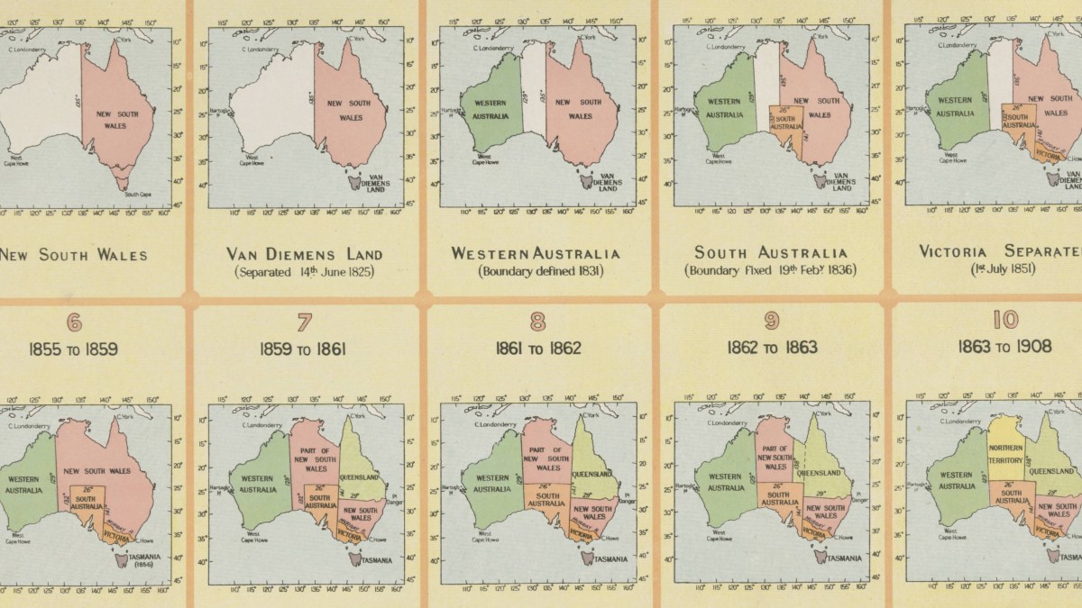 But that was not to be. As this map (the origin of which I unfortunately haven’t recorded) shows, NSW has steadily shrunk in size as other states and territories emerged or were split off from the ‘mother colony’. The map, dating from 1904, shows the evolution of NSW (and the nameless other half of the country) to Australia.