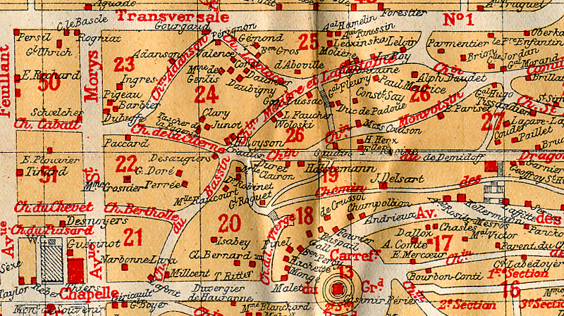 As far as I can tell, the map is undated; but it certainly looks like it’s pre-World War II, maybe even pre-World War I. Although Doors frontman Jim Morrison is buried at Père Lachaise, it’s therefore unlikely he is the Morrison mentioned in section 68.
