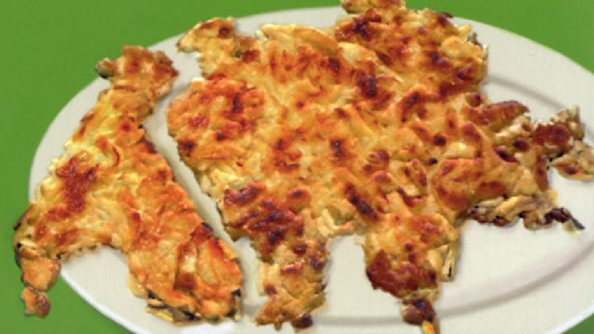 This dish is made mainly by frying grated potatoes in a pan. It was formerly eaten as breakfast by farmers in the (German-speaking) Bern canton. The original conceit of the Röstigraben was that it constituted the western limit of the German Swiss culture, beyond which people spoke (and ate) differently.