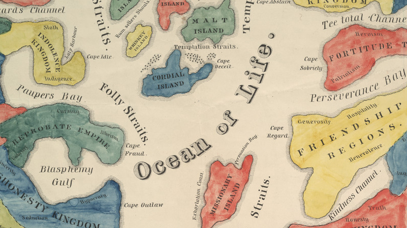 The ‘dry’ lands in the East are, north to south: Repentance Kingdom, Resolution Province, Fortitude Territory, Wisdom Empire, Friendship Regions, Industry Province, Morality Kingdom, Religious Possessions, Happiness Empire and Contentment Province. Vices make for more colourful place-names than virtues – but still, some thought-provoking – or at least chuckle-inducing – toponyms here: the Religion Channel, Cape Sobriety and the Gulf of Reform.