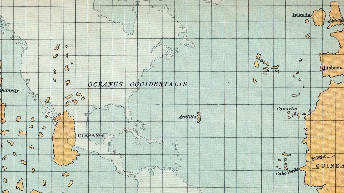 The reference to Sete Ciudades (‘Seven Cities’) is reminiscent of an Iberian legend of seven bishops fleeing the Arab conquest of the peninsula and founding a city each on the island, which became a sort of Utopian commonwealth. Some claim the legend of Antillia represents an earlier discovery of the islands that eventually became known as… the Antilles. Improving nautical knowledge eventually led Antillia to disappear from maps, but the legends surrounding it continued to inspire explorers for a long time – e.g. the ‘Seven Cities’, that were sought in the Southwest of the US or even posited on Cape Breton Island in Canada.