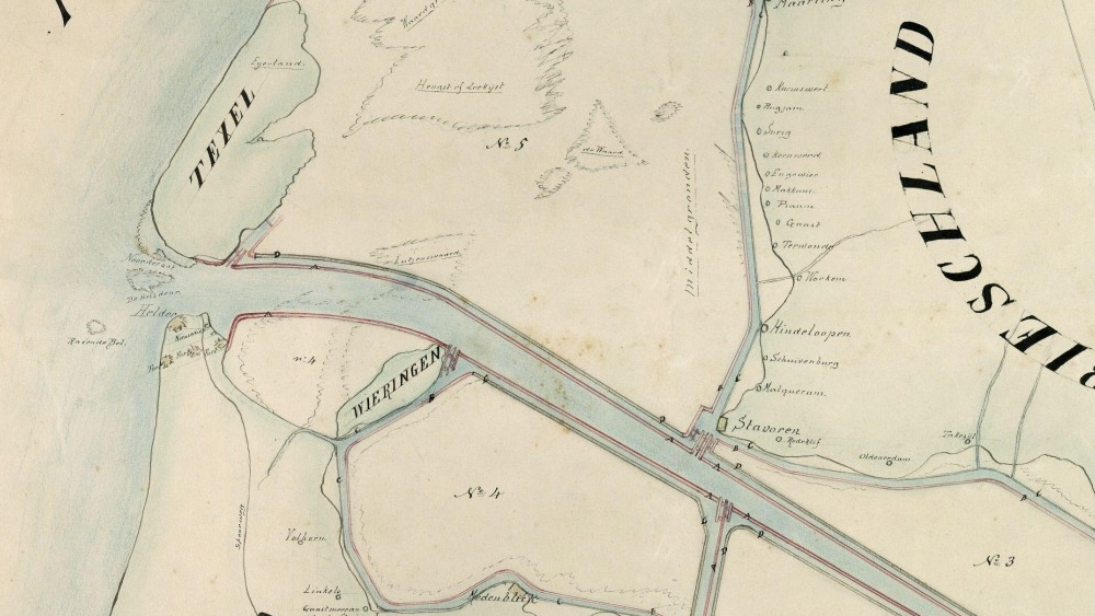 In the Zuiderzee, four more islands (with similarly narrow canals between them and the mainland) would be constructed. All of these would be divided in two main parts by a broader canal, entering the new lands south of Texel and abutting northeast of the former island of Urk. A slightly narrower canal would branch of halfway to connect it to Amsterdam.