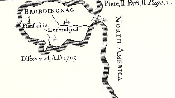 As indicated by this map printed in early editions of Gulliver’s Travels, the land of Brobdingnag seems to be located on the Californian coast, just north of New Albion. The inclusion on the map of that English colony, named by Francis Drake, might be to underline the nowhere-ness (or u-topia) of Brobdingnag, as the exact location of Drake’s land-claim was deliberately obfuscated by the English crown, and has been debated fiercely ever since.