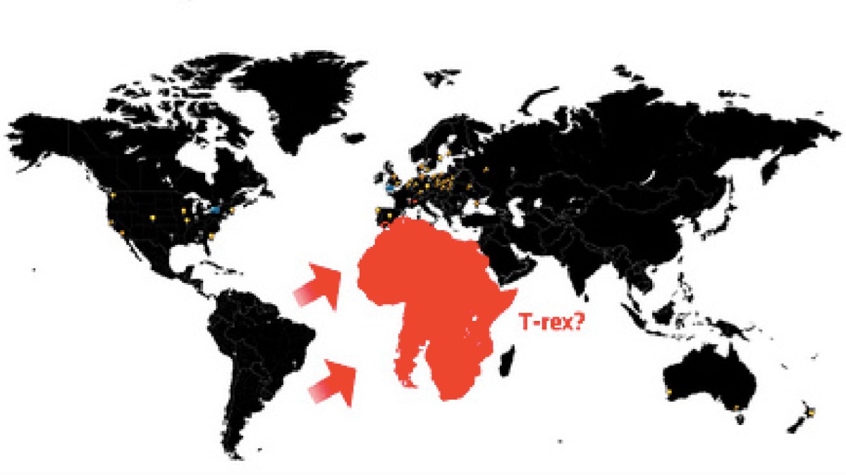 The narrow southern strip of South America shared by Chile and Argentina is the beast’s lower jaw, Africa’s southern part its upper jaw. The big, blunt bulk of West Africa is the animal’s neck. Lake Victoria, the greatest of African lakes, doubles as the menacing eye of the Afro-Latinosaurus…
