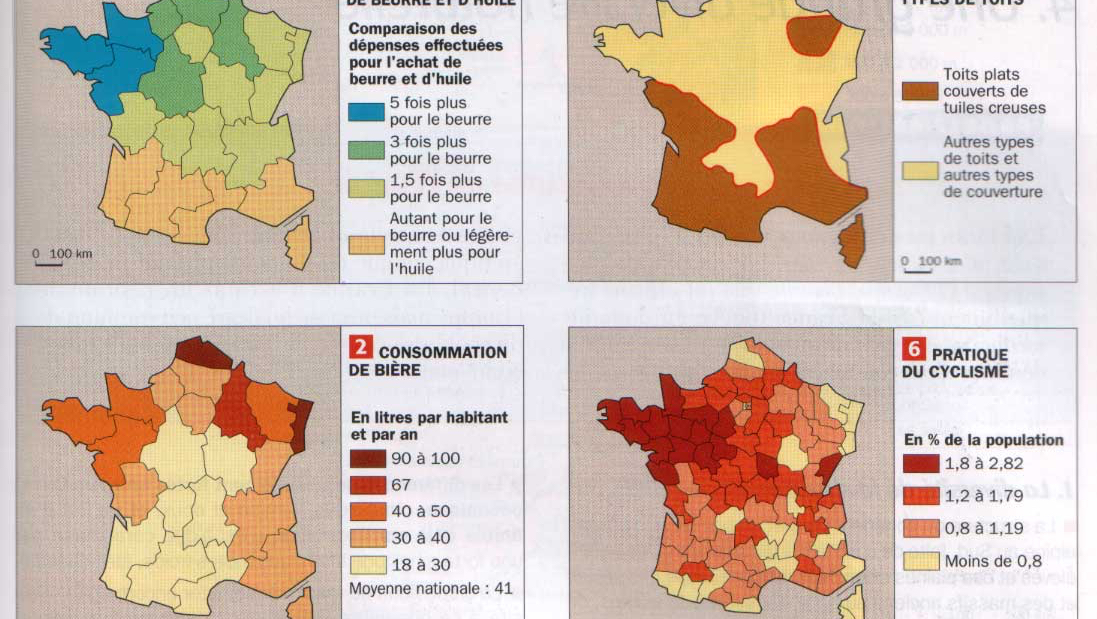 Each of these five maps, taken from the 1997 edition of Géographie Première, a schoolbook by Rémy Knafou, slices up metropolitan France in surprising ways, but also every time reflecting, in some way, the divisions described above.