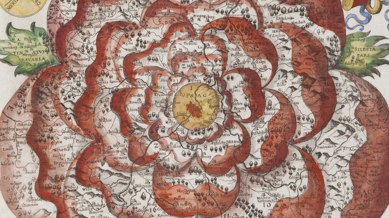 With Justice and Piety, reads the Latin emblazoning this 17th-century illustration, a map that shows Bohemia as a stylised rose. If that region is in bloom, the map suggests, it is precisely by the application of those virtuous qualities.