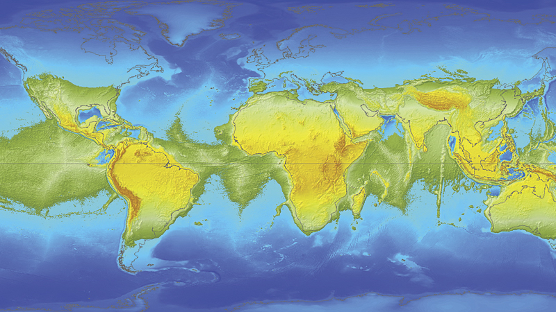 Now imagine the earth stopping cold in its tracks. No more centrifugal force. No more bulging. Over time, the earth’s shape would approximate a perfect ball. But most of the immediate readjusting would be done by the most fluid element on our planet’s surface: the water, which by some measurements currently bulges as much as 8 km (5 mi.) at the equator. The consequences would be far more dramatic than any current climate change scenario. The oceans would not nibble at our shores. They would rise thousands of metres and swallow continents whole.