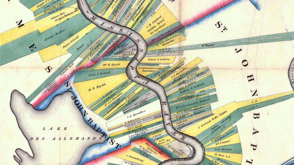 The blithe meanderings of the Mississippi have produced more than one cartographic oddity (see also #178 on the Kentucky Bend, and #208 on ancient Mississippi courses). Her snakey contortions do the trick here too, combining as they do with the straight and narrow lots to yield a fan-like effect. This interplay between bendy river and straight lots is enhanced by the gorgeous colouring of those lots: pink and light blue for the handful of cotton plantations, far outnumbered by the orange-yellow and faded green for the sugar plantations.