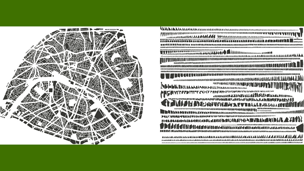 The transformational process involved is threefold: the city on map A is deconstructed, its blocks are classified for size and shape, then reassembled in rows, arranged by type, on map B. The result is reminiscent of butterfly cases and other taxonomical tableaux rather than of a street map. More Linnaeus than Mercator.