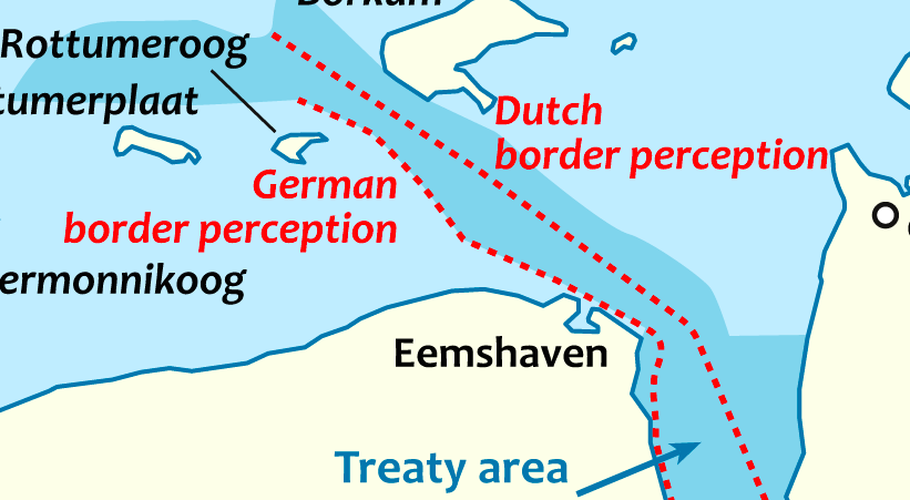 The Dollart, originally dry land, but lost to the North Sea in medieval floods, lies to the west of the Ems river estuary. Its western shore is Dutch, the eastern one German, but the exact course of the border in between is contested. Predictably, Germany insists it’s close to the Dutch shore, while the Netherlands maintains a claim nearer the centre of the Dollart.