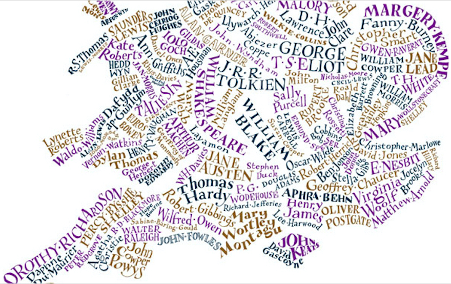 Or in this case, the poetry and prose of place. This literary map of the United Kingdom is composed of the names of 181 British writers, each positioned in parts of the country with which they are associated.