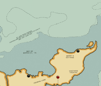 New Penzance takes up a central location on the map. The island consists of a n elongated land mass, oriented southwest to northeast, with a large, north-facing, double-headed promontory bolted onto the middle. The easternmost point is named as Cape Cooper, on a small cape between it and the large promontory lies Summer’s End, which features prominently in the film. Other locations on the island are Roman’s Ruins [5], near its centre, and Yeoman Lane, Vineyard Theatre and Berry’s Cottage near the unnamed, eastern cape.
