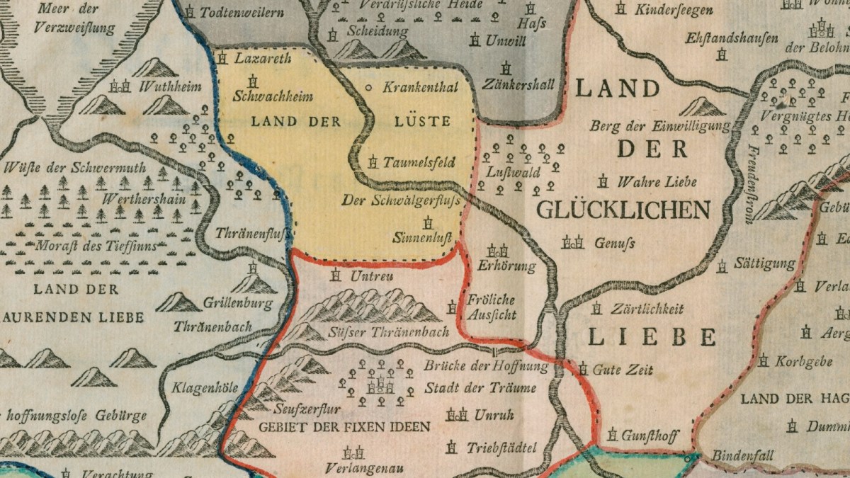 WuthheimAnger’s HomeThränenflussFlood of TearsGrillenbergWhim MountainThränenbachRiver of TearsKlagenhöleComplaint PlaceDas hoffnungslose GebürgeHopeless MountainsVerachtungLoathingStrengeStrict PlaceMorass des TiefsinssSwamp of ProfundityWerthershainWerther’s GroveWüste der SchwermuthDesert of MelancholyLAND DER LÜSTE: LAND OF LUST