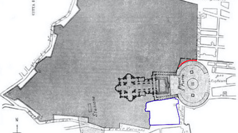 Blue border: Italian territory on which the Vatican has extraterritorial rights. Red border: territory disputed between Italy and Vatican City.