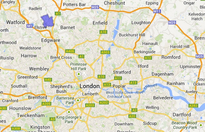 The location of the Elstree and Borehamwood eruv, established in 2010, within Greater London.