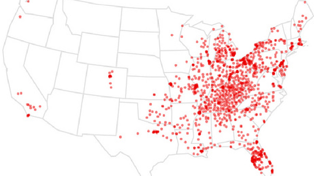 Another chain with a clear, albeit somewhat larger domain: a big cluster in Michigan, Ohio and Indiana, a seeping into the South, with major outposts in Atlanta and the big Texas cities. The Pennsylvania state line acts as a magic border to northeasterly expansion.