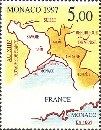 The map in the upper right corner shows the shrinkage which occurred in the nineteenth century. Monaco succeeded in tearing loose from Genoa and had its independent status confirmed by the King of France and the Duke of Savoy in 1489. But in the centuries that followed, the Grimaldis presided over a territory under increasing pressure from the consolidating nation-states surrounding it. From 1793 to 1814, Monaco was even occupied by revolutionary France.