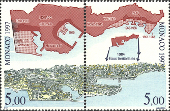 Having lost so much terrain on land, Monaco turned to the sea. The map on both lower stamps shows the amount of territory gained by landfill (plus dates of completion); as well as the extension of territorial waters to 12 nautical miles in 1984. The panoramic view at the very bottom is of the present-day western half of Monaco.