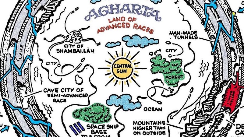 In some hollow Earth theories, there is a city or civilisation at the core of the Earth called Agartha (sometimes spelled Agartta, Agharti or Agarttha). This seems to derive from Aryavartha, which to the Hindus is the place of origin of the Vedas. An alternative name for this city is Shamballa (or Shambalah), which is Sanskrit for ‘place of peace’. Chinese, Russian and Kirgiz folklore all have their own names for a similar place. Sometimes, both names are used simultaneously (as in this map), with Agartha designating the whole interior and Shamballa the main city.