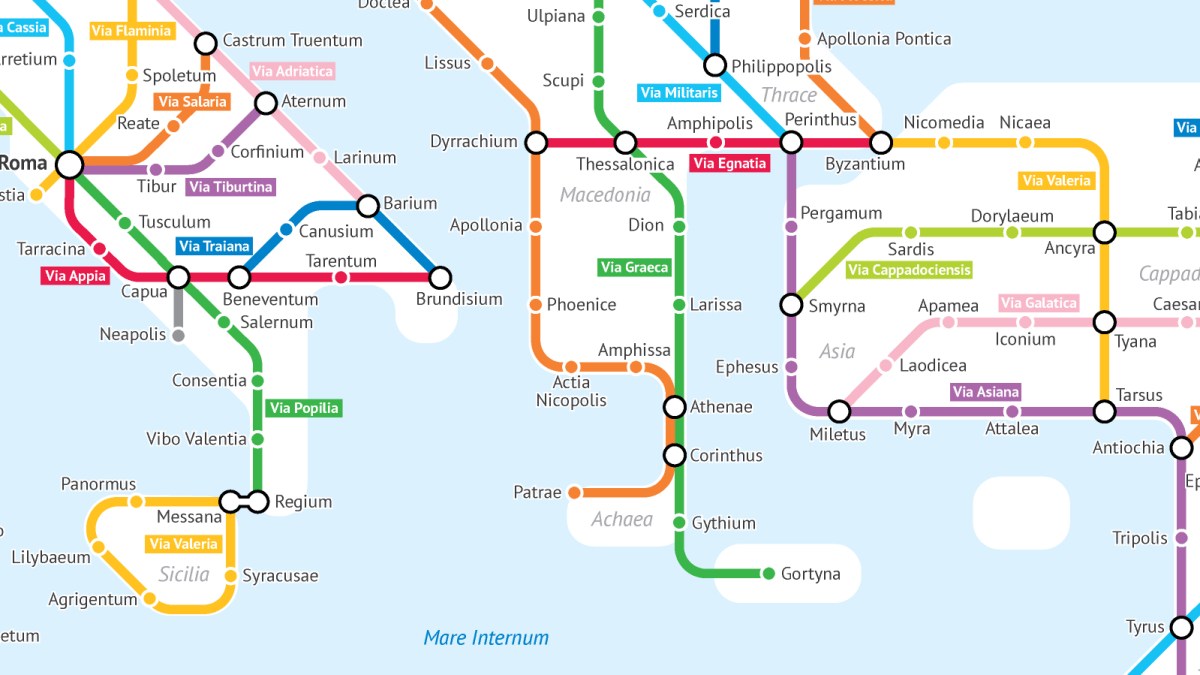 The map does not include sailing routes, which would be the preferred way to cross the Mediterranean. In summer, Rome to Byzantium would take two months on foot, one month on horseback and about 25 days by ship. Roman Roads is a work in progress; Sasha plans to publish an updated version soon.