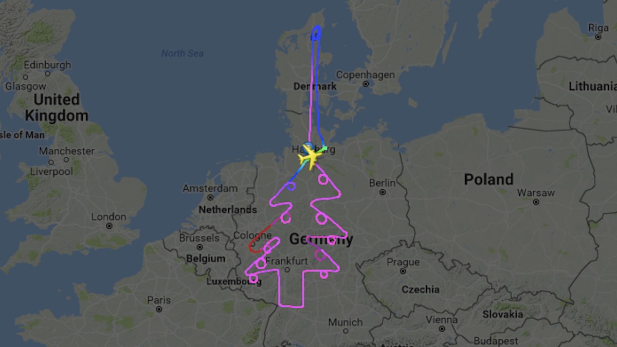 Making the most of a test flight over Germany and Denmark earlier this week, an Airbus A380 drew a giant Christmas tree on the map – ornaments included.