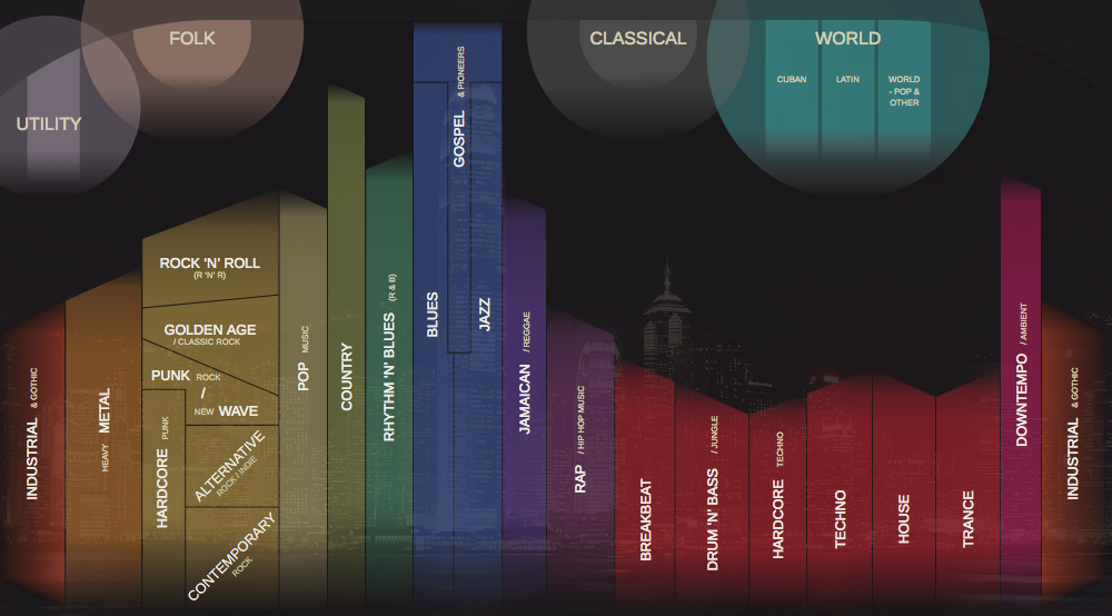 The four suns/moons hovering above the stylised cityscape are for Utilty, Folk, Classical and World music. These four ‘Super-genres’ are zoomable, but the genres they contain are not clickable. The focus of Musicmap is on the buildings below, each one another Supergenre housing a multitude of Genres and Subgenres.