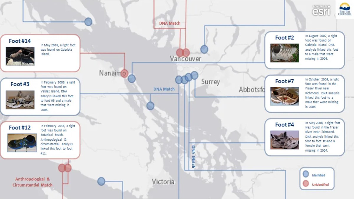 DNA analysis allowed the RCMP to link most of the feet to persons that had been reported missing and were presumed dead due to accident or suicide. The New Balance sneakers belonged to a woman who had jumped off a bridge; the first foot from Jedediah Island was linked to a man known to be suffering from depression who had been missing since 2004. The foot found in November 2011 was matched to a local fisherman who had gone missing in 1987. In all, three pairs of feet were “matched” to each other.
