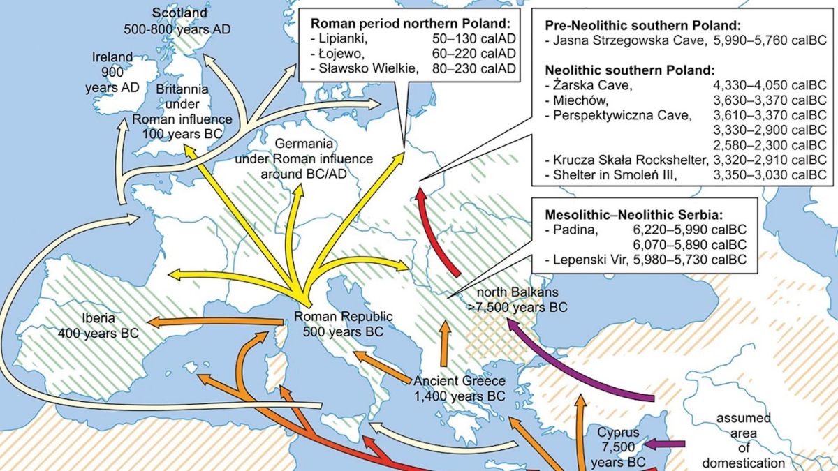 Until recently, the thinking was that cats arrived in Europe only in Late Antiquity (roughly the 3rd to 7th century AD). As the above map shows, that still holds true for many parts of the continent, but an earlier influx via Asia Minor into the Balkans, and further north, seems to have preceded it.