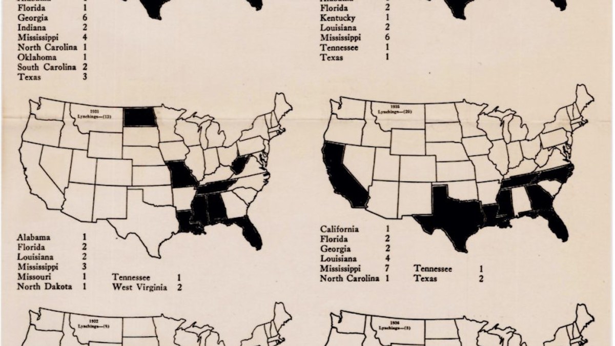 These sober maps have a chilling topic: the prevalence of lynchings throughout the U.S. from 1930 to 1938. They were published by the Association of Southern Women for the Prevention of Lynching (ASWPL), an organization that sought to eradicate the practice by changing attitudes rather than laws.