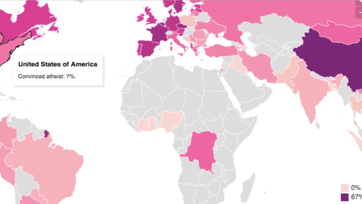 And what about the U.S.? America scores 7%, which is near the median, and in the company of Greece and Russia. Americans are only slightly less atheistic than Israelis, Finns and Mongolians (all 8%), and slightly more so than Ukrainians, Lithuanians and Vietnamese (all 6%).