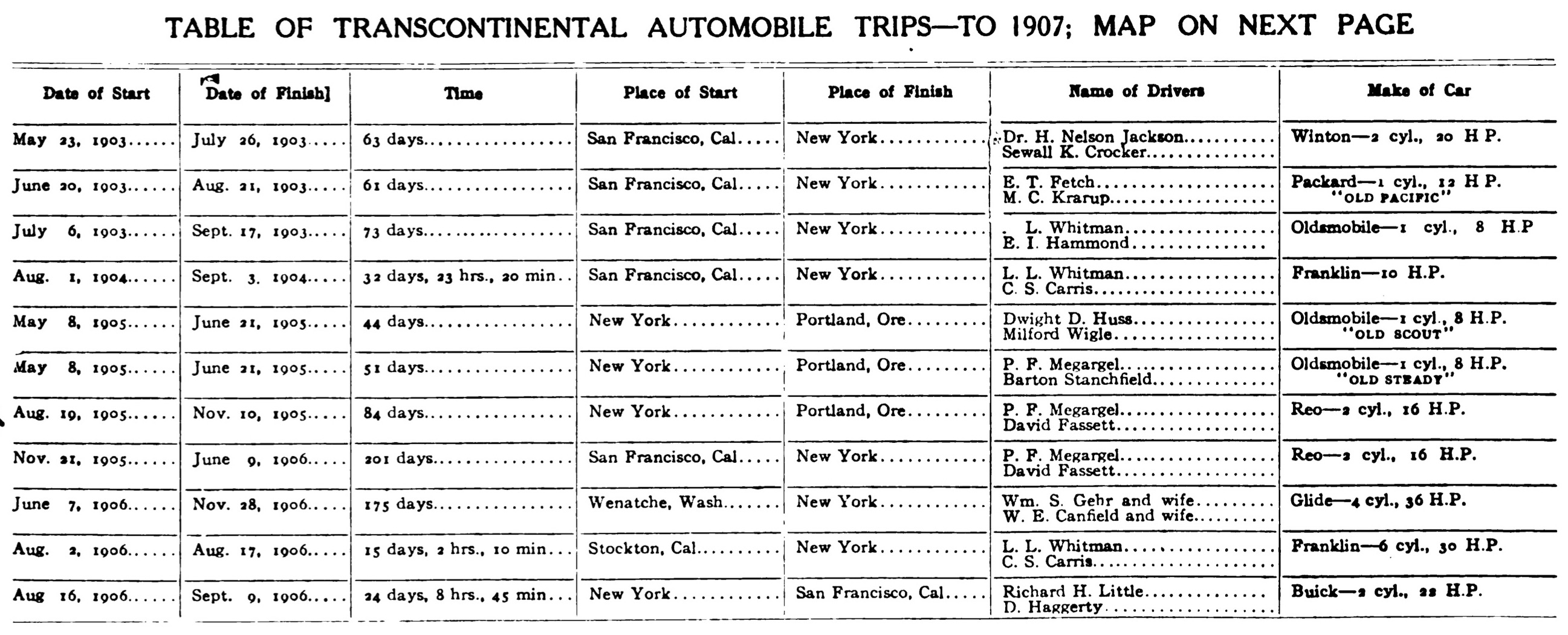 Despite the book and the documentary, the pair have never quite become household names on par with aviation pioneers like Charles Lindbergh or Amelia Earhart. The cross-country adventurers who followed in their tire tracks and are even less remembered, though they are on this map. This table, also from the 1907 Blue Book, brings their accomplishments back from oblivion for just a moment. (Here’s an animated version of the map, showing all 11 trips in sequence.)