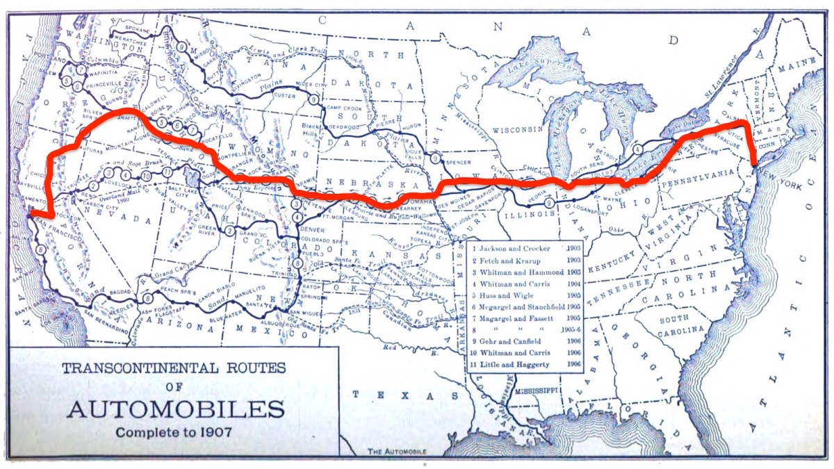 This map is from the 1907 edition of the Automobile Association of America’s Blue Book. It shows the routes of all the cross-country car trips completed until then: no more than 11 in total — and strangely, all duos. (The Jackson-Crocker trip is highlighted in red.)