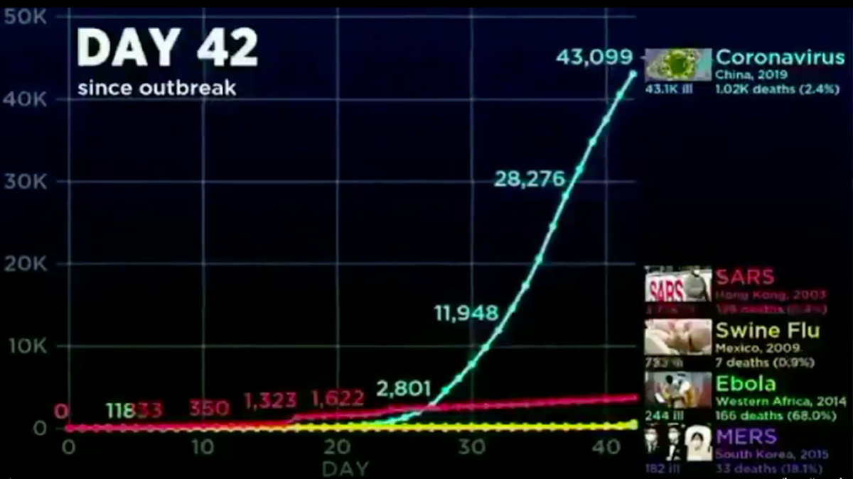 First, the standalone clip, which has been seen more than two million times. It compares the speed of the coronavirus outbreak to that of a few other recent ones: