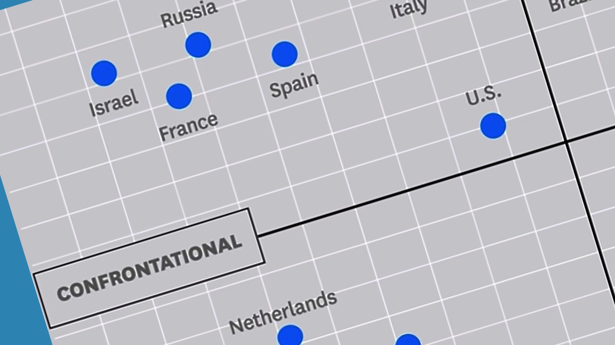 In general, the map says: For cold-as-fish negotiations, go to northern Europe or eastern Asia. If you want hugs and small talk with your deal, go to a Latin country (or a very cold or hot one — e.g., Russia and India). But are Danes really that much more confrontational than Swedes? And shouldn’t the Brits — a people who say “Sorry” when you bump into them — be much further to the right?