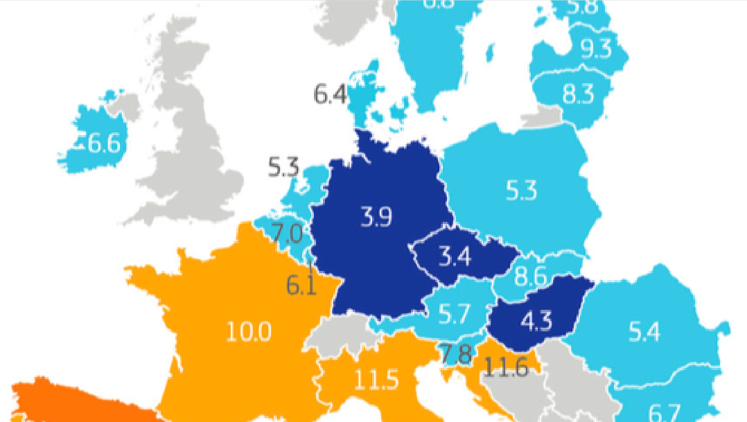 The map shows the unemployment rates of the member states – and the stark differences for those rates between member states in the north and south of the Union. But the eye is immediately drawn to the land mass of the United Kingdom: coloured not in the blues or oranges that indicate unemployment rates in the EU, but the grey of the non-member states that dot the map.
