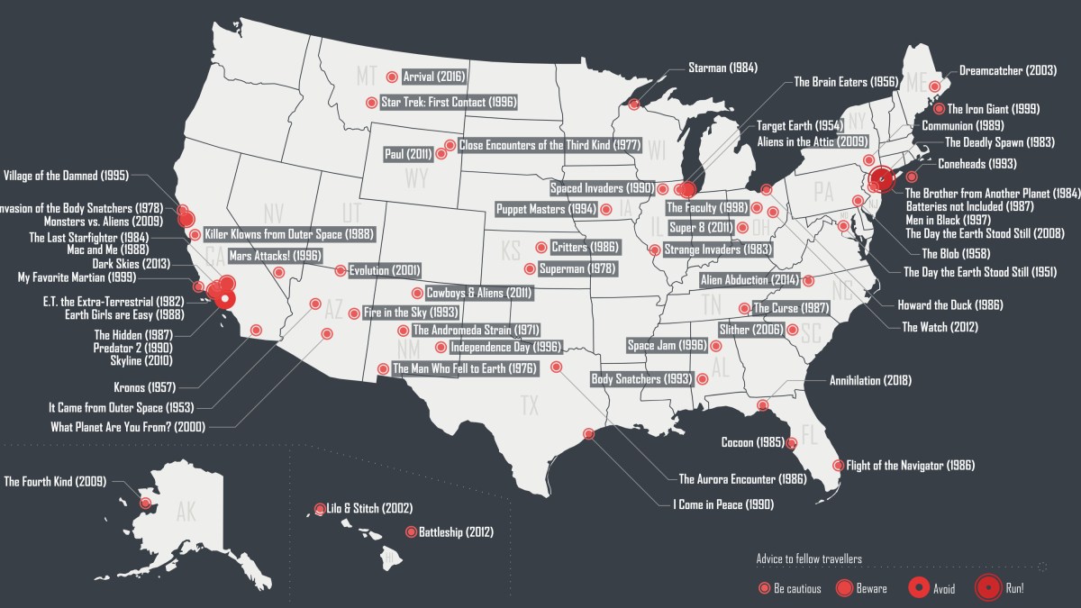 The mapmaker has kindly provided dates for each movie, which tells us something about the peaks and troughs of alien-landing excitement in the U.S.